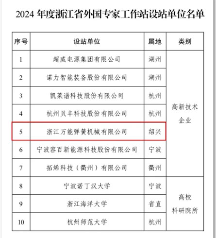 19th 12.2024 在全球化與科技創(chuàng)新的驅(qū)動下,浙江省外國專家工作站成為吸引國際高端人才、推動企業(yè)創(chuàng)新發(fā)展的重要平臺。自2020年《浙江省外國專家工作站管理辦法》實施以來,紹興市在吸引外籍專家方面取得了顯著成績。截至目前,紹興市已有6家單位獲批為省級外國專家工作站,位居全省前列。 2024年,浙江萬能彈簧機械有限公司榮...